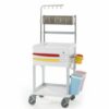 F 45-3 Medical Trolley Constructed from ABS AND STEEL Rail around 3 sides of the top of the Trolley 4 Full width lockable drawers with 40 partitions A waste bin and a pull out writing shelf is provided Storage for IV drugs on hook rod Needle dispensing container, Swab container, Patient chart holder attached Mounted on 4 X brake castors